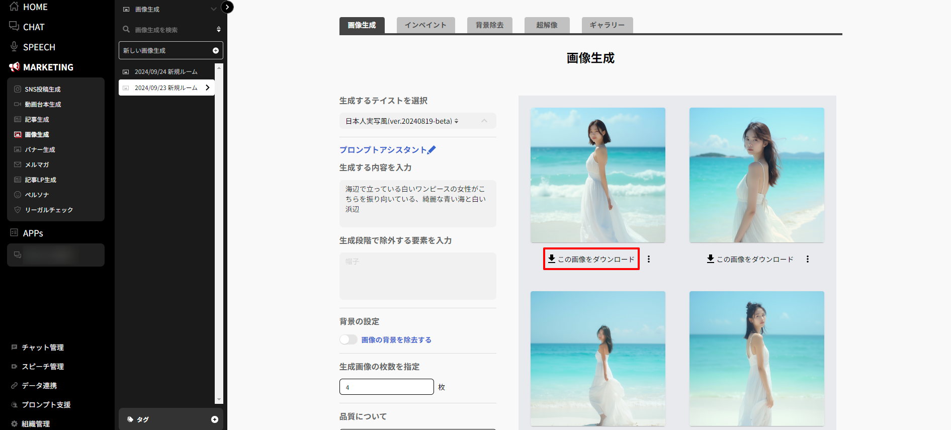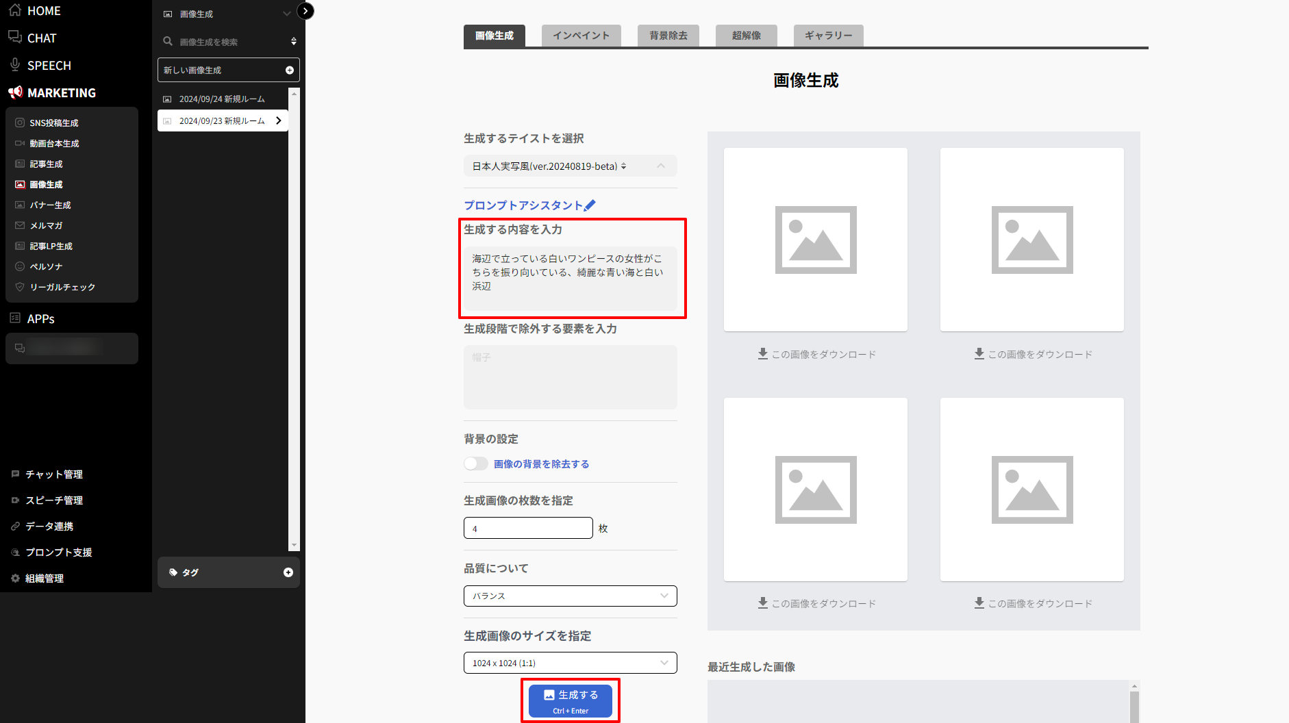 画像生成機能では、バナーやHPで利用できる画像を生成できます。