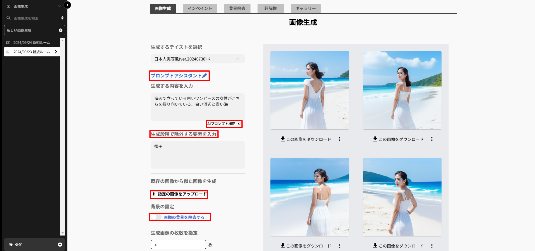 単語を入力した後クリックすると、画像を綺麗に生成できるプロンプトが自動生成されます。 - 生成する段階で除外する要素を入力