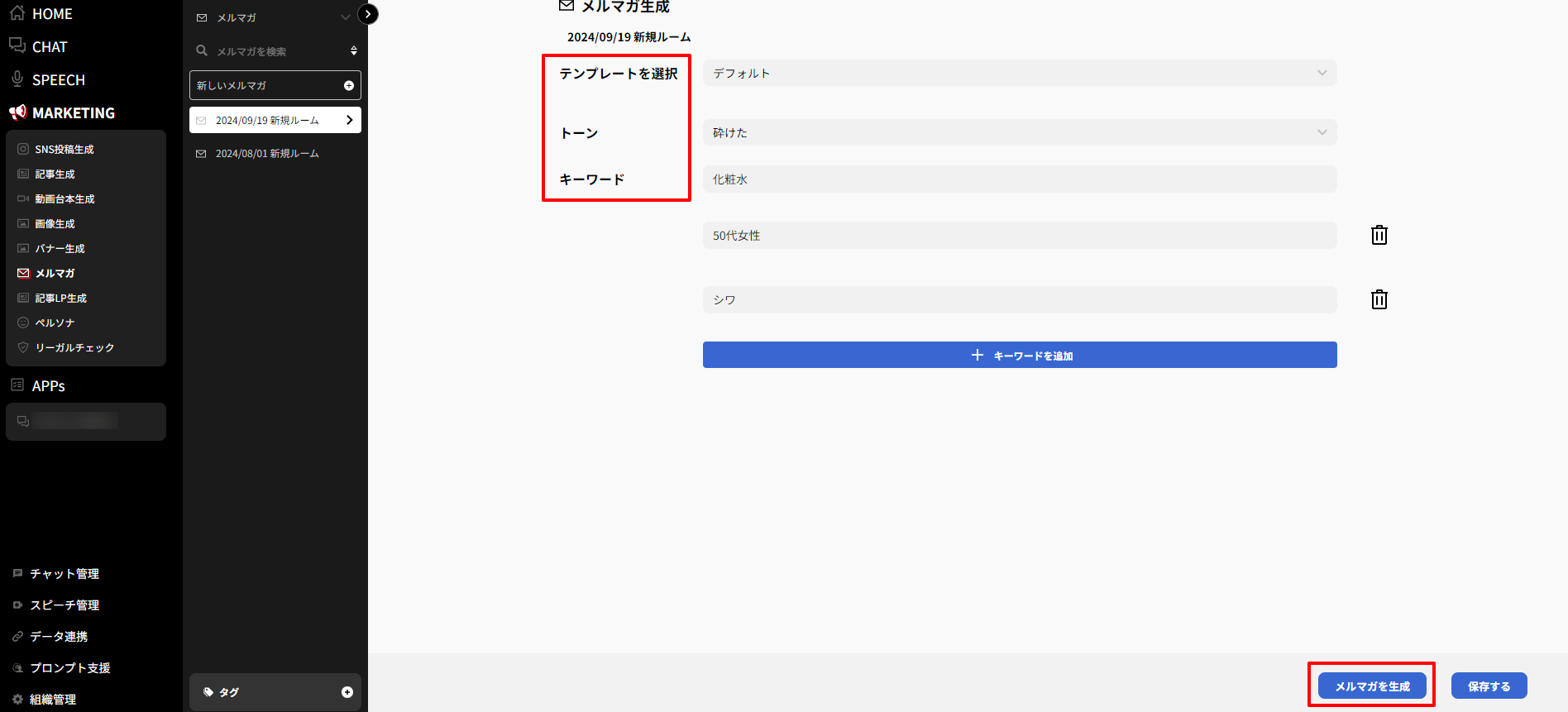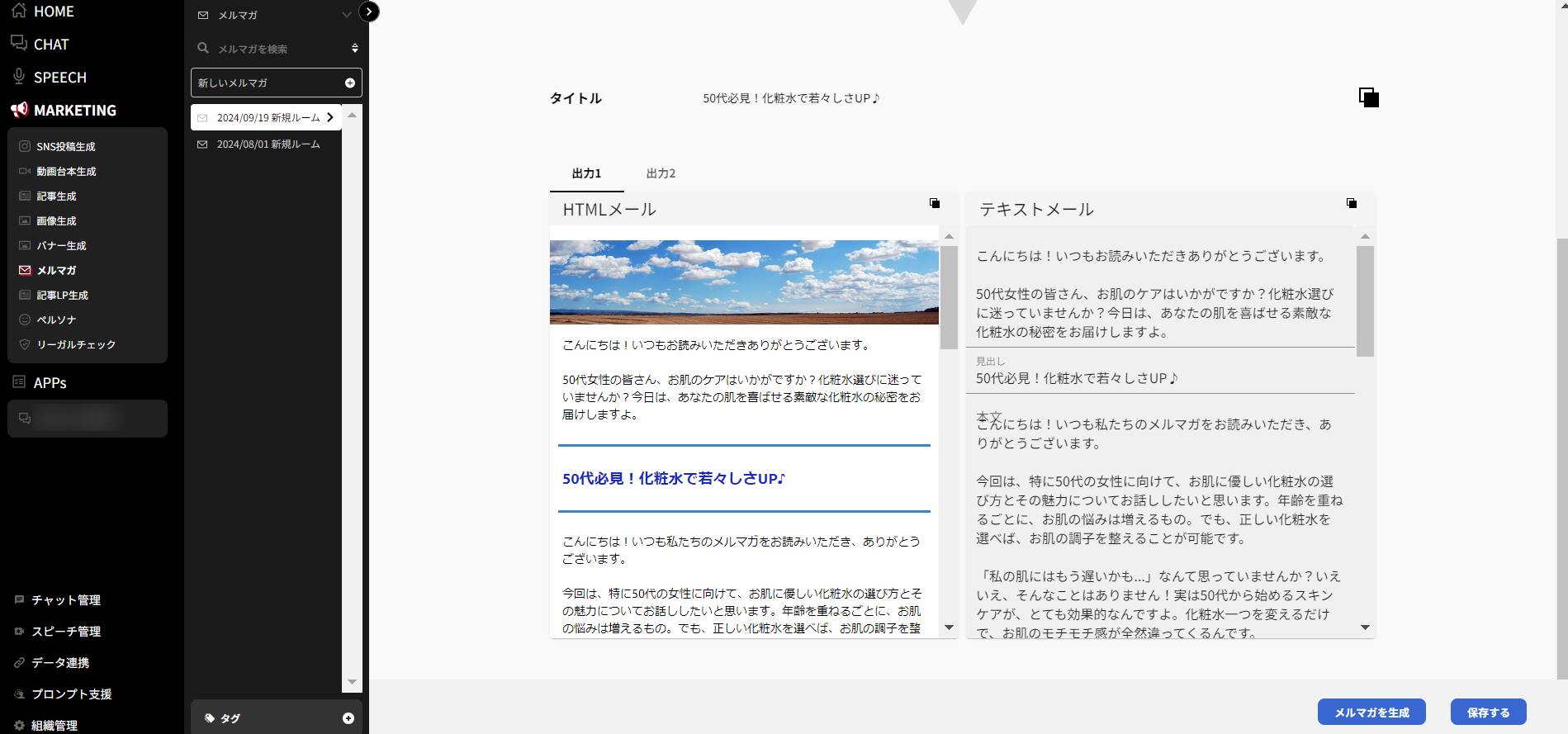メルマガ生成機能では、マーケティング目的のメルマガを生成できます。