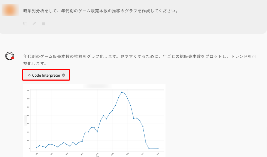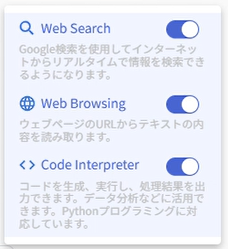 - 右上のプラグインから、「Code Interpreter」をオンに設定