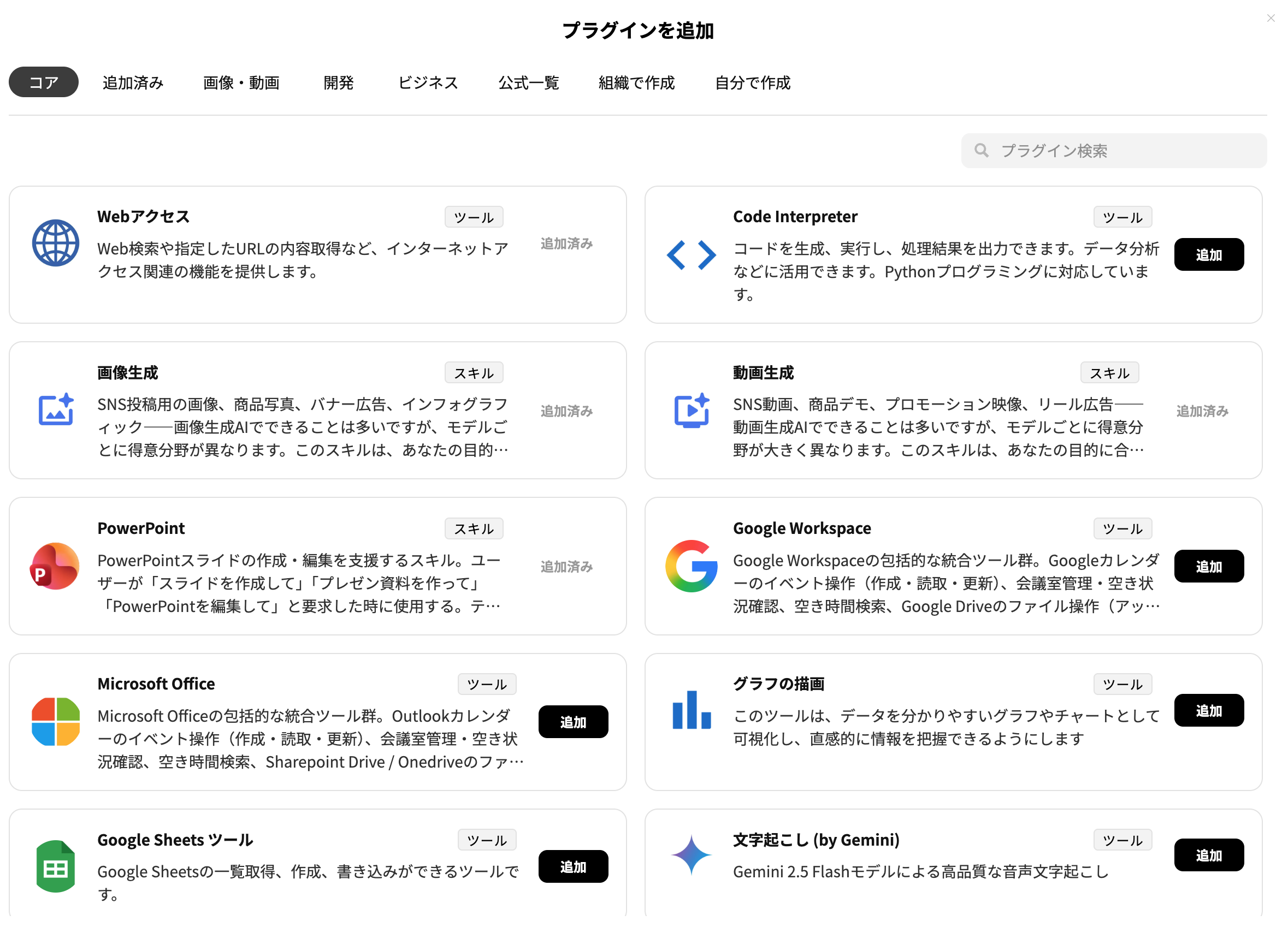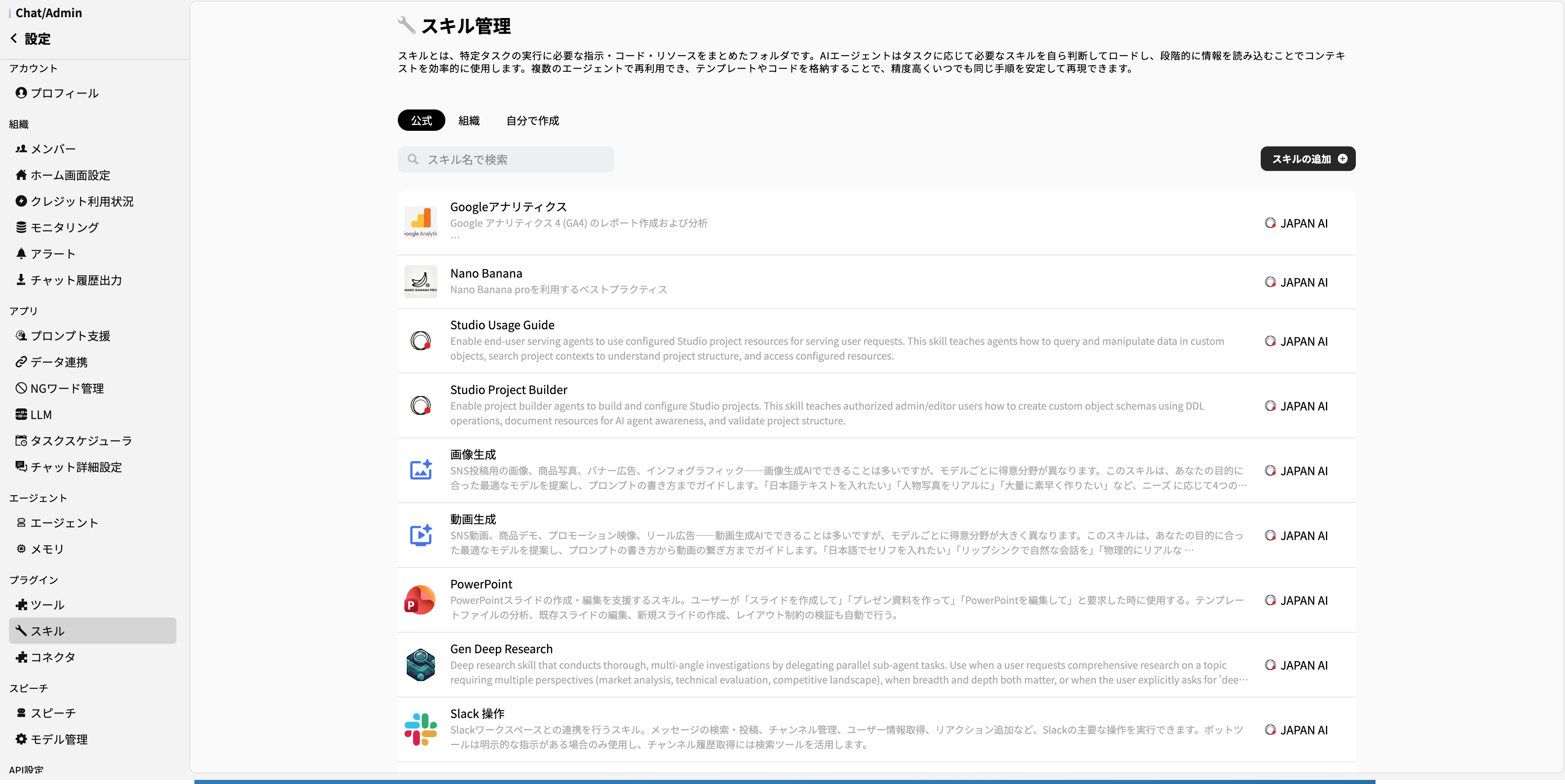 - 公式:JAPAN AIが提供する公式スキルの一覧。すべてのユーザーが利用可能