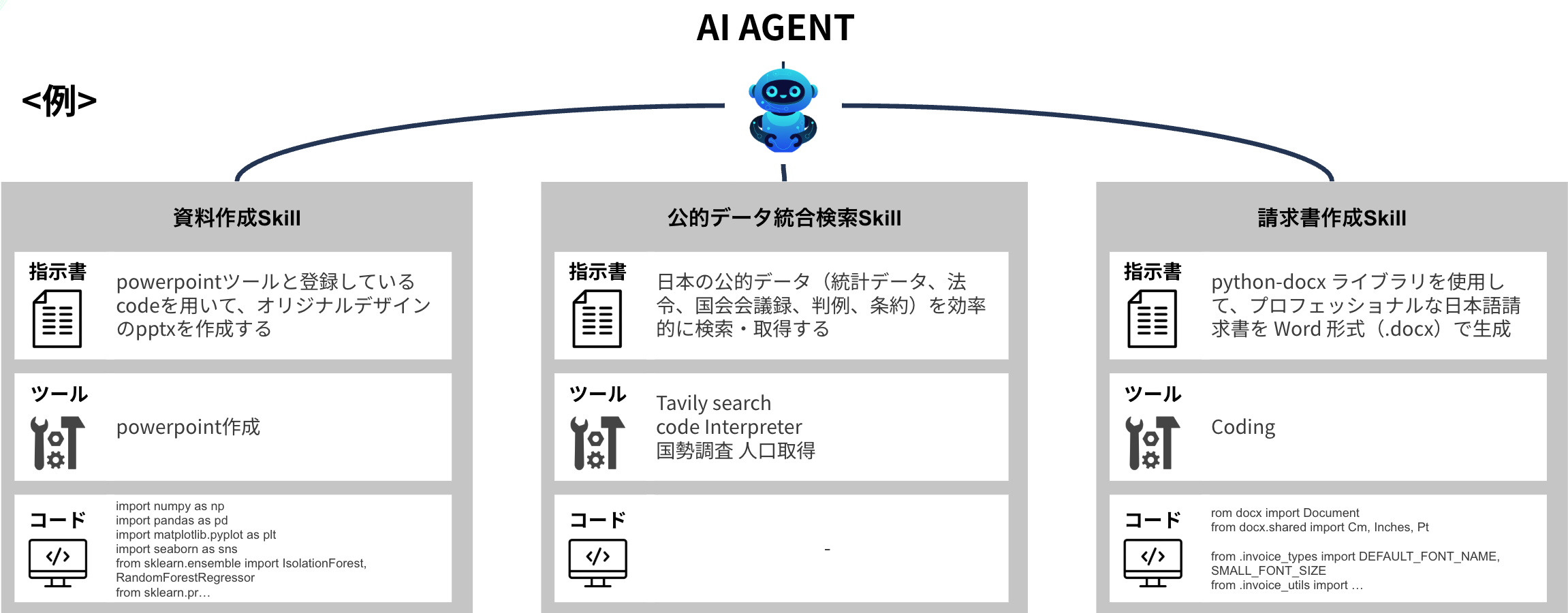 | 再利用性 | 一度作成したスキルは、複数のエージェント・プロジェクトで共有可能 |